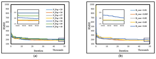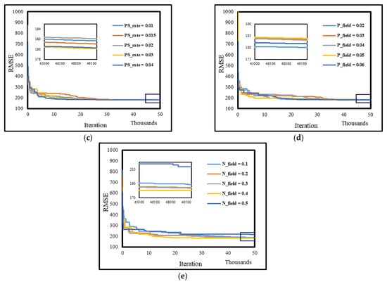 After creating the EFO-MLP hybrid, it is trained by mining the training group. Since metaheuristic algorithms are population-based iterative techniques, optimum values should be considered for these two parameters, i.e., population size (NPop) and the number of iterations (NIt). Although many optimization algorithms reach a stable situation by around 1000 iterations, the EFO needs more effort. Based on experience and also evaluating the behavior of the model, the EFO-MLP was implemented by a total of 50,000 iterations. The appropriate values for NPop, as well as four other parameters, were determined one by one by testing different values. The convergence curves of the tested EFO-MLPs are shown in Figure 5. First, the models with different NPops (25, 26, 27, 28, 30, 35, and 40) were tested (when R_rate = 0.01, Ps_rate = 0.01, P_field = 0.02, and N_field = 0.4). Figure 5a shows that the NPop = 26 gives the lowest error. Thus, the subsequent models were tested with this NPop. Five R_rates of 0.01, 0.015, 0.02, 0.03, and 0.04 were similarly assessed. According to Figure 5b, R_rate = 0.01 is the most suitable one. Next, investigating the effect of Ps_rate in Figure 5c revealed that the lowest error is obtained for Ps_rate = 0.03. As is exhibited in Figure 5d, P_field experienced the values of 0.02, 0.03, 0.04, 0.05, and 0.06, and P_field = 0.02 remained as the best value. Lastly, the values considered for N_field, 0.1, 0.2, 0.3, 0.4, and 0.5, are depicted in Figure 5e, which demonstrates the lowest error for N_field = 0.4.