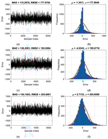 Moreover, from a graphical point of view, the histogram charts in Figure 6 show that the small errors outnumber large values. This can be derived from the sharp shape of the diagram around zero and the vicinity. Regarding the overall trend of these charts, the magnitude of the error increases as the frequency falls.
