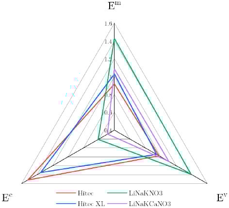 Regarding specific mass energy density, values for nitrate-based materials are the most attractive closely followed by carbonates, whereas chlorides and fluorides are in general relatively less interesting. It is worth to point out that Solar Salt has one of the highest values, only surpassed by nitrate mixtures containing lithium or lithium and calcium. In the case of other mixtures, LiNaKCO3, NaKZnCl, and NaBF have very close values to those reported for Solar Salt, giving high-temperature applications almost the same mass energy density. For specific volume energy density, the values are very similar to the previous ones; however, fluoride-based materials enhance their figures, almost to the same level as the nitrates, whereas LiNaKCO3 has an improved performance compared to Solar Salt. Finally, KPIs of previous chloride-based materials perform poorly in comparison to the other candidates, but its specific energy costs are more than half the Solar Salt ones, even achieving a reduction over 75%. This makes them one of the best choices for future high-temperature applications over fluorides and carbonate-based materials.
