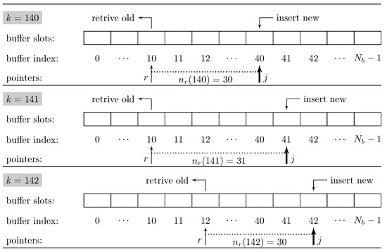 The insertion pointer of the VTD from [11] marches continuously forward through the circular buffer one step per cycle time . The value of j is calculated by the remainder of the division (mod) of the time k by , see Equation (17). The old content of the slot pointed by j is replaced by the new value. The retrieval pointer r lags one MAW number of slots behind j, see Equation (18). The old value is retrieved from the slot pointed by r. The buffer slot is left intact after retrieval.