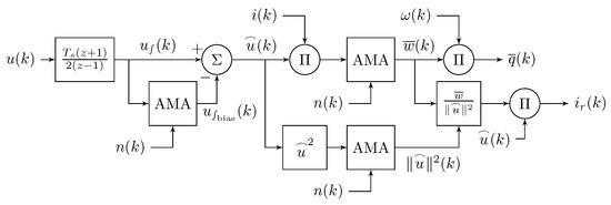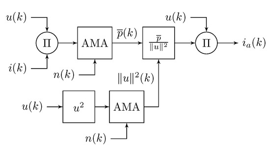 Two VTDs for performing AMAs were presented in the previous sections. It is now convenient to represent the calculation of the CPT electrical quantities in the discrete time domain. Figure 3 shows a block diagram of the active power and active current measurements given by Equations (3) and (9). One AMA is used for and another one is used for . The active current depends on both AMAs.