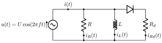 The effects of the LVTD and CVTD in the measurements of a CPT transducer are analyzed in this paper with the help of computer simulations. The comparisons between a single AMA with rounded MAW, a WAMA, and a HAMA are also performed with simulations. To do that, a single-phase ideal sinusoidal voltage source feeding a relatively simple load is chosen. The load is composed of ideal components: one resistor R, one inductance L, and one diode in series with a resistor . Figure 5 shows the test model.