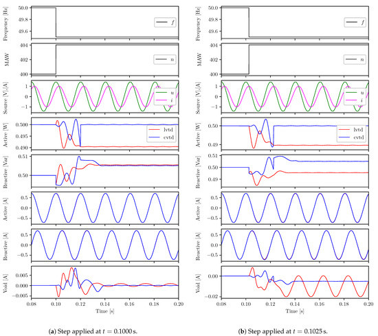 A disturbance with of amplitude and a frequency of is applied to the source voltage’s frequency at instant for both RL and DB-scenarios. Figure 9 shows a detail from to of the computer simulations. The measurements of the CPT transducer with single CVTDs with rounded MAWs are shown in red. The measurements with WAMAs are shown in blue.
