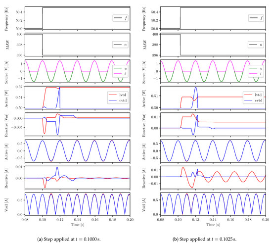 The CPT algorithm is simulated in the discrete time domain with a fixed cycle time and sampling frequency . At the beginning of each processing cycle, the source’s voltage, current, and frequency are sampled simultaneously. There is no delay nor noise in the measurements. The sampled values are hold constant throughout one complete calculation of the transducer’s algorithm, as usual in microprocessor implementations. Intentional variable sampling times, unintentional variations of the main software cycle time, or non-simultaneous sampling of the voltage and current are beyond the scope of this paper.