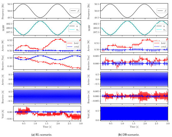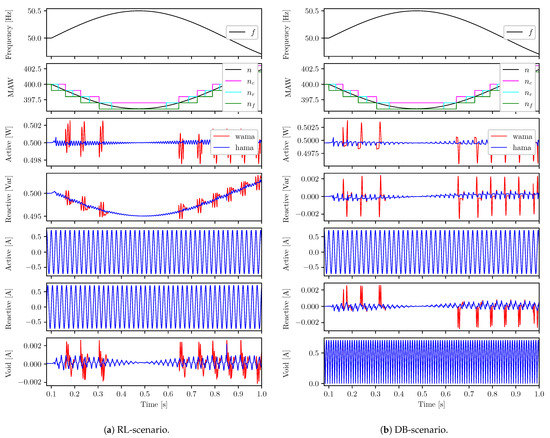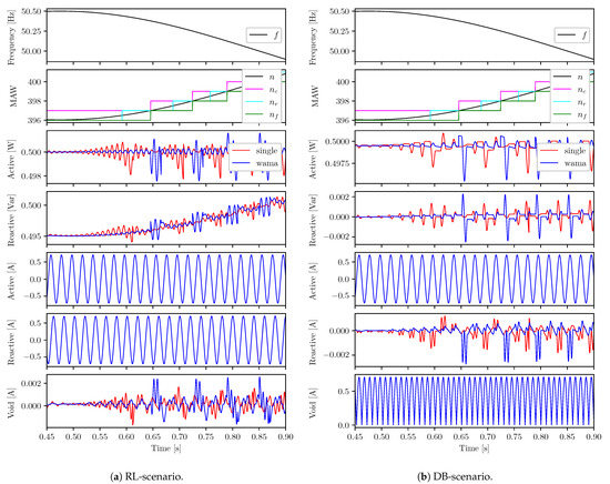 Active power: the RL-scenario is shown in Figure 9a. The amplitude of the oscillations in the active power measured with single AMAs increases steadily as n drifts apart from after . Just before , is updated. This causes a transient in the red curve. Subsequently, the amplitude of the oscillations decreases and reaches a minimum when n is closest to . The measurement with WAMAs features smaller oscillations up to instant , when and change. However, the transients with WAMAs are worse than the ones with single AMAs. In the DB-scenario, the pulsating instantaneous power (not shown) is nonsinusoidal. It peaks at the positive semi-cycle of the source’s voltage and is zero during the negative semi-cycle. A parcel of those pulses slips through the single AMAs with rounded MAWs. The WAMAs, instead, are better at filtering the pulses.