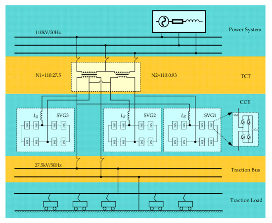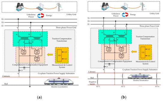 - Luo, L.; Chen, P.; Cui, P.; Zhang, Z.; Zhou, Y.; Xie, X.; Chen, J. A current balance compensation method for traction substation based on SVG and V/v transformer. In Proceedings of the 2017 IEEE Transportation Electrification Conference and Expo, Asia-Pacific (ITEC Asia-Pacific), Harbin, China, 7–10 August 2017; pp. 1–6. [Google Scholar]