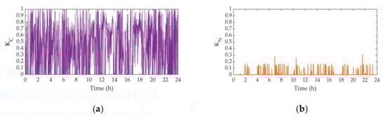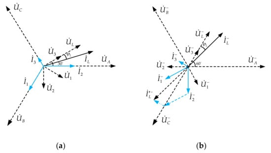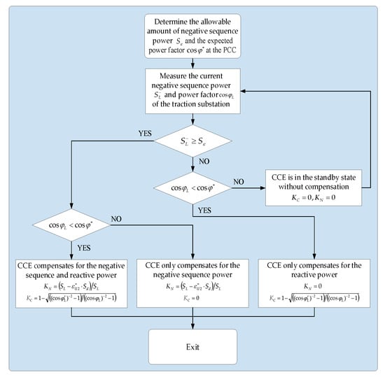 - When the negative sequence power generated by the traction load is greater than the allowable negative sequence power at PCC, and the power factor is less than the target power factor value , the negative sequence and reactive power are compensated by CCE at the same time. Based on the expected target, the value of and can be determined according to Equations (18) and (20). Then, according to Equation (10), the , , and are obtained. Under the traction condition of traction load, is inductive or capacitive reactive ( or ), is capacitive or inductive reactive ( or ), and is capacitive reactive;