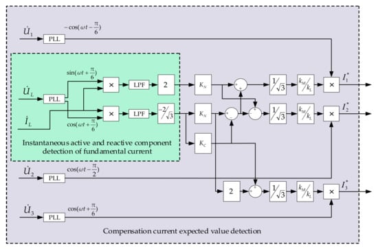 - When is less than or equal to , and is less than . Only the reactive sequence power is compensated by CCE. Therefore, can be determined by , and based on the expected target after compensation, the value of can be determined according to Equation (18). Then, according to Equation (10), the , , and are obtained. Under the traction condition of traction load, , , and are all capacitive reactive;