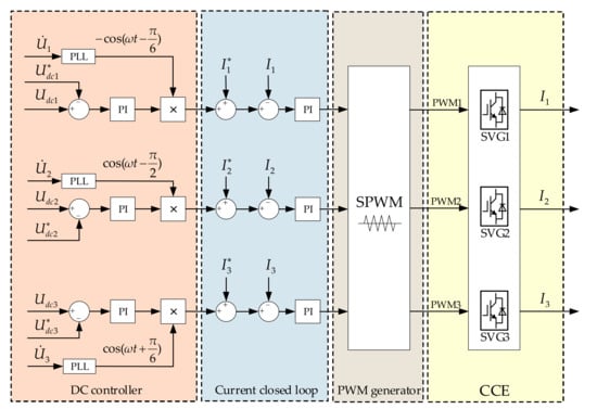 - When is less than or equal to , and is greater than or equal to . The negative sequence and reactive power generated by the traction load can meet the compensation target, no additional compensation is required. Therefore, and can be determined by and . CCE operates in standby.