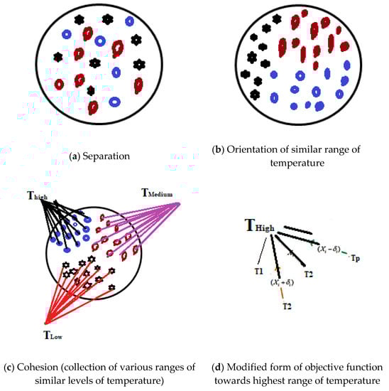 Figure 1. The pivotal behavioral characteristics of the dragonfly are (i) separation, (ii) alignment, and (iii) cohesion. The genetic property of dragonfly neurons is utilized to trace and traject the highest range of temperature from a solar panel. The trajectory path is computed as an objective function for all values of the traced parameter until the required temperature is captured and is amaximum. The cohesion property of dragon implemented in the algorithm helps and focused to collect similar range of temperature at all points in the solar panel.