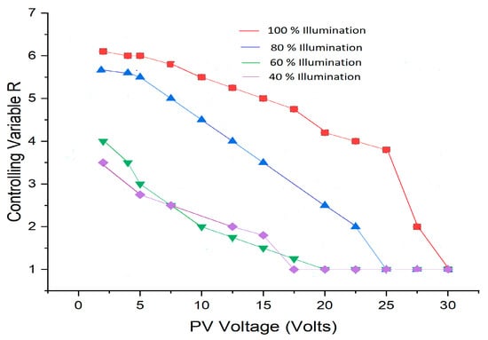 For different ranges of irradiance and temperature variation the value of varies abruptly. This abrupt variation causes the constants in the controlling variable R to vary. In the third term in Equation (7) Kig is the current gain . Therefore, the third term in Equation (7), Kig is replaced with and if it is substituted in the third term of Equation (7), we obtain . Here, R3io gives the units of voltage. Based on this variation the population membership functions are initialized as given in Equation (2). Then the objective function, as shown in Equation (1), is iterated continuously until the maximum amount of power is tracked irrespective of temperature variation, irradiance, and partial shading condition. The simulation test results showing the variation of R with an increase or decrease in the value of constants.