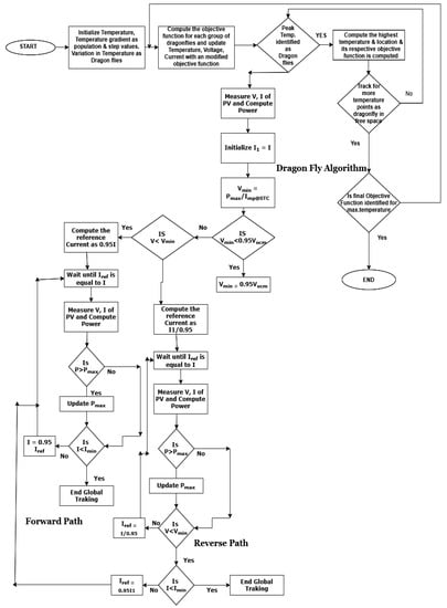 These characteristics of dragonfly are taken into account along with the MPPT algorithm to develop a new dragonfly MPPT forward and reverse algorithm. The flowchart shown in