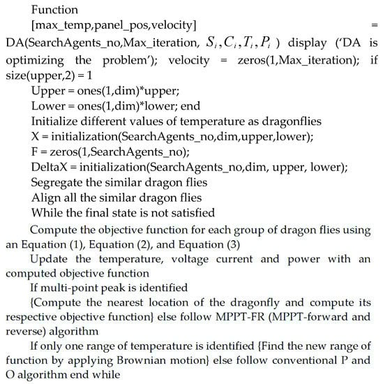 4. Pseudo Code of the Dragonfly MPPT-FR Algorithm