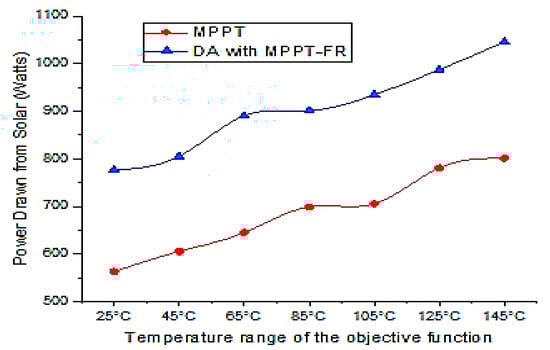 Figure 13. From the recorded output it is observed that the power drawn from the solar PV system is the maximum to a value of around 1046 Watts at T = 145 °C. For a continuous variation in temperature from solar insolation, the implemented dragonfly forward-reverse algorithm tracks the maximum amount of power. The characteristic of the dragonfly algorithm allows the designed system to trace the highest temperature with a minimum of processing time. Additionally, implementation of this algorithm understands the present climatic condition and adapts itself to the present environment to self-realize and track the highest temperature to produce the highest power at its output.