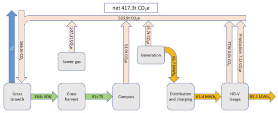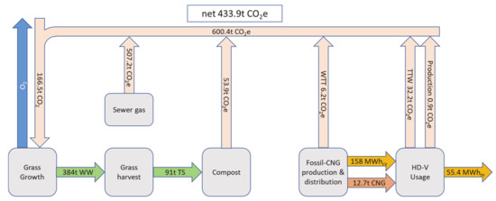 An alternative case where 80% of the waste grass is diverted to a controlled AD process to produce methane for use in the transport mission.