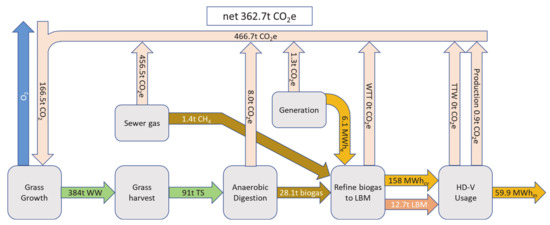 Figure 7, waste grass is actively diverted into controlled anaerobic digestion and the resulting biogas refined to LBM. Sewer gas is also diverted to a similar LBM refining plant produce biomethane to power natural gas trucks. Moderate CAPEX costs are incurred, which are offset by a reduction in OPEX. There is a moderate increase in electricity demand. Vehicle lifecycle CO