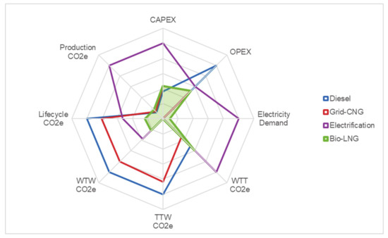 The sustainability factor for baseline diesel, fossil CNG, battery electric and biomethane vehicles is shown in