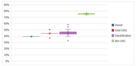 65] WTW GHG emissions are presented for biomethane produced from different feedstocks, food waste and manure. Simulations show benefits of 50–75% for biomethane from food waste and 45–75% for fuel derived from manure. In [