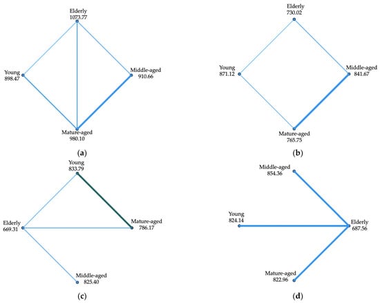 Pair comparisons. Categories of age of respondent: (a) D19: Do you think world’s climate is changing; (b) D22: Climate change caused by natural processes, human activity, or both? (c) D23: To what extent feel a personal responsibility to reduce climate change? (d) D24: How worried about climate change? All relations contrast tests with significance p < 0.1%.