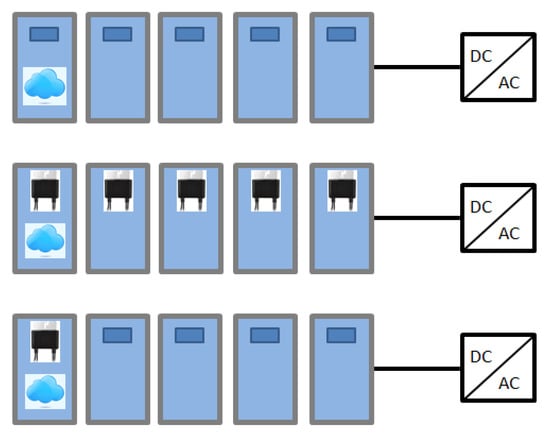 Power optimizer and micro-inverter systems have been proven to mitigate partial shading losses [8] when compared to a single string inverter system, but both solutions come with an extra cost for the whole system. Finding a way to mitigate mismatch and partial shading losses at a low cost has attracted the interest of several researchers, e.g., [9,10]. In the above context, installing power optimizers at panels that experience the most shading in a system (selective deployment) is a relatively new solution that has been proposed. In Figure 1, the approach of selective deployment of PO (SDPO) can be compared with other approaches.