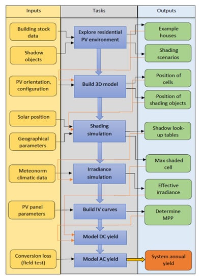 A yield simulation model, which was developed in previous work [14], has been adapted to accommodate the selective deployment of power optimizers. The complete PV performance (python-based) model for this research is comprised of six different models integrated into one: A 3D SketchUp model, a shading model, an effective irradiance model, a temperature model, a current and voltage (I-V) model, and a system loss model. A flowchart of the complete modelling procedure for the yield simulations can be seen in Figure 3. The evaluation of the selective deployment of POs is based on the simulation results for a set of different shading scenarios during a typical meteorological year (TMY) in Eindhoven, The Netherlands. A field test of a reference and SDPO system was utilized to fine tune the simulation model.