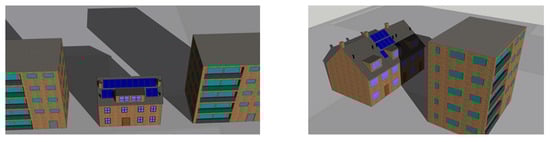 - Medium shading scenario: Selected shading objects were present on each system. For the detached house case, one building, one dormer, one pipe, and one chimney were used, while for the terraced house case, one dormer, three pipes, and one chimney were used.