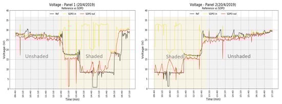 Figure 5 shows the operation of a SDPO in real time in comparison to a string inverter system, which is not optimized. The yellow dotted line denotes the input voltage (actual VMPP of the panel as detected by the SDPO), the red line denotes the output voltage, and the black line denotes the voltage on the same panel (under the same pole shading) at the reference system. The shade from the pole is at panel 2 early in the morning and moves gradually to panel 1 at around noon. When the panel is not shaded, no conversion occurs at the DC–DC converter and a conduction state is achieved. While without shade the voltage of the reference and optimized module are very similar, when partial shading occurs, the string inverter of the reference system is able to bypass groups of solar cells, thus limiting the voltage output. The input voltage of the SDPO due to partial shading is very high, indicating operation on a local maximum power point. In the output, a large voltage reduction can be seen, which is comparable with the reference module’s voltage.