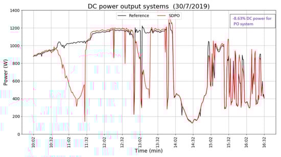 While there is a small improvement in terms of power throughout the day for the optimized panels, the opposite is true when partial shading is present on panels for which the power is not optimized by SDPOs. Therefore, it is critical at the design phase of the PV system to identify the potentially shaded panels beforehand and optimize accordingly. In Figure 7, the output of the reference and SDPO optimized system can be seen. As long as the un-optimized panel 3 is partially shaded, the output power of the reference system is higher than that of the SDPO system.