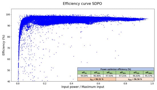 The efficiency of the operating SDPOs was measured directly in the input and output, thus providing accurate data without cable and connection losses (see Figure 9). The European ηEU and Californian ηCEC efficiency were calculated based on the empirical weight factors [16].