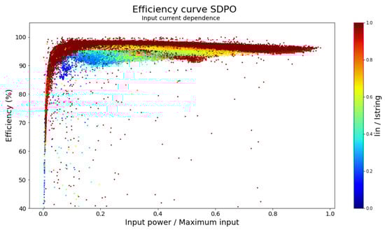 The SDPOs under test were rated at 300 W, but the panels that they were connected at were 265 W at STC. Therefore, some data are not available for 100% nominal output efficiency and have been calculated with the maximum values that were measured during the outdoor test. The ηEU and ηCEC are around 96.5%, but there is a large variation for the low and middle range of the power output. The reason for this efficiency variation can be seen in Figure 10, where the efficiency curve of Figure 9 has been subdivided using color coding according to the normalized input current of the SDPO.