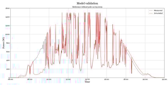The simulation model, which is explained in detail in previous work [14], was tuned with field test specific power electronic specifications and efficiencies. Moreover, some data was excluded due to uncontrolled shade casting unevenly on the systems (mainly during morning and evening hours). In Figure 12, the measured and simulated power can be seen for a sunny day. Note that the “clean time” taken into account is between 9:42 and 17:40. The deviation between simulated and measured energy throughout the day is 3%.