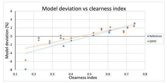 A clear correlation between the weather conditions and the model deviation can be deduced from Figure 14. The yield model systematically underestimates the power output on cloudy days (low clearness index) and higher yields for sunny days (clearness index >0.6) are predicted well, while yield values very close to the measured ones can be seen for partly cloudy days. This is probably caused by the irradiance separation model (Reindl2) [19], which calculates the diffuse and direct parts of the irradiance. These irradiance separation models are derived through empirical correlations and are partially valid for certain atmospheric conditions [20]. The higher yields on sunny days could indicate degradation of the solar modules. The panels are from 2013, having operated for 6 or more years outdoors, and should be expected to have suffered a degradation of around 2–4% from their initial power [21]. During partly sunny days, the model behavior counterbalances the effect, leading to a very good approximation of the daily energy yield. Overall, previous research on comparing various yield models has shown acceptable errors and fairly accurate results [22] from predictive yield assessment.