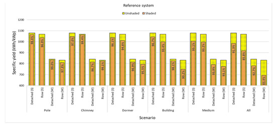In Figure 15, the AC-specific yield of the systems is presented in unshaded and shaded scenarios. A variety of obstruction elements present in the built environment are shown together, with variations for different system orientations. Dormers and neighboring buildings seem to create by far the most influential shadow patterns, causing the highest annual losses of 4–6% and 3–7%, respectively. When evaluating the medium and heavy shading scenario, the losses increase further, up to 7–15% depending on the orientation and building type.