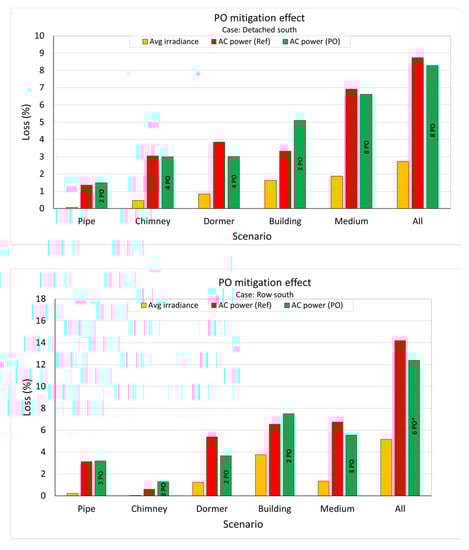 In Figure 16, the losses per system and building type can be seen for a South orientation. The SDPO system seems to operate with lower losses in most scenarios; however, in some scenarios the SDPO system operates with higher losses than the reference system. This occurs due to the fact that the efficiency losses of the SDPOs are dominant during homogeneous shading of the whole system. The variation of optimized panels is different per shade type, starting from two to eight panels. The irradiance losses on the system surface reveal the disproportional losses that occur. For example, an exhaust pipe causes around 0.1% in irradiance losses on the PV system surface on an annual level, but it causes at least 10–12 times more energy loss and is considered the most detrimental shade pattern in these terms. The row house scenario experienced higher losses due to the geometry of the house and the fact that, in row houses, not only is the dormer around the owners system affected, but the neighboring dormers and obstructions also affect system performance. The irradiance losses are even higher in the row house scenario, and mitigation of the SDPOs mostly affects heavy shading scenarios and dormers.