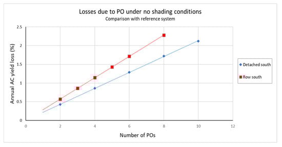 The effects in terms of annual yield losses of SDPO on a system without any shading occurring are presented in Figure 17. A linear dependence of the annual yield losses and the number of SDPOs deployed can be concluded. Moreover, the losses are higher for the row house due to the fact that the PV system rated capacity is smaller than that of the detached house. The losses are associated with the operating efficiency of the SDPOs. It is important to deploy SDPOs only for panels that are affected by shade.