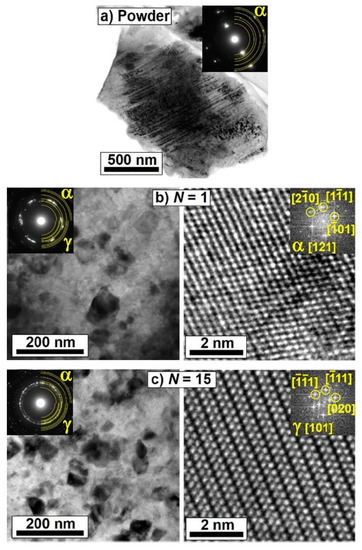 TEM images and corresponding SAED patterns (left) together with high-resolution lattice images and corresponding FFT diffractograms (right) for (a) tetragonal α-MgH2 powder, disk processed by HPT under p = 6 GPa for (b) N = 1 and (c) N = 15 whole turns [57].