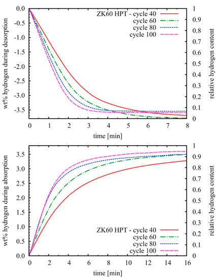 Dehydrogenation (top) and hydrogenation kinetic curves (bottom) obtained at 350 °C, 10 bar absorption pressure, 0.001 bar desorption pressure of the HPT-deformed ZK60 alloy [61].