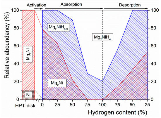 Partially hydrogenated and dehydrogenated states of a nanocrystalline Mg75Ni25 sample processed by HEBM and subsequent HPT technique revealed the formation of Mg2NiH0.3 hexagonal solid solution and the monoclinic Mg2NiH4 hydride phase during absorption [77]. The desorption induced changes in the relative amount of the two hydride phases indicated that the volumetric decrease of Mg2NiH4 and.Mg2NiH0.3 is not simultaneous, i.e., at the initial stage of dehydrogenation, the decomposition of Mg2NiH4 is favored, while subsequently, the Mg2NiH0.3 → Mg2Ni + 0.3H2 reaction becomes more dominant (see Figure 5). It was also shown that the combination of HEBM and HPT is an effective deformation route to preserve the nanostructure of the alloy during the entire hydrogenation-dehydrogenation process. Complimentary high-pressure calorimetry confirmed a two-step sorption sequence both upon heating and cooling [78]. At the early stage of decomposition, the desorption of Mg2NiH4 occurs which is followed by the dehydrogenation of Mg2NiH0.3 solid solution. The enthalpy of hydrogenation/dehydrogenation reactions determined from the corresponding van’t Hoff plots suggests that HPT promotes the destabilization of the metal-hydrogen bonds.
