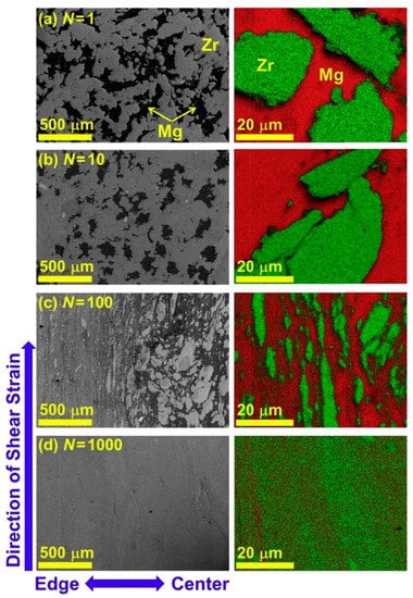 The large plastic strain accompanying the high-pressure torsion procedure not only results in the reduction of the grain size and introduction of lattice defects but also new stable and even metastable phases can form in certain systems [37]. Accordingly, Mg2Sn and Mg2Ni intermetallics have formed after N = 100 rotations in Mg-V-Sn and Mg-V-Ni systems, respectively. Further increasing the number of revolutions results in the evolution of metastable phases in the Mg-V-Pd [37] alloy. It is noted that the corresponding binary systems have negative (Mg-Pd [79] and Pd-V) and positive mixing enthalpies (Mg-V [37]) as well. It was also revealed that metastable phases can develop even in immiscible systems with positive heat of mixing such as Mg-Ti [80] and Mg-Zr [81].The ultra-severe plastic deformation can extend the solubility of the minor components, thus new hydrogen storing materials can be manufactured. For example, in the Mg-Zr system N = 1000 revolutions results in significant mixing of Mg and Zr (see Figure 6). Mutual dissolution of elements in the Mg-Ti [81] and Mg-Zr [79] systems were observed by scanning electron microscopy, whilst the formation of BCC, FCC and HCP Mg-Ti [81] and HCP Mg-Zr phases [79] were confirmed by X-ray diffraction. Furthermore, during shear straining of MgH2-TiH2 mixture metastable ternary Mg-Ti-H hydride phase develops [82].