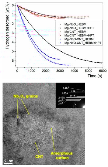 In a recent research, the influence of the different deformation routes on the microstructural evolution and hydrogen storage behavior of nanocrystalline Mg catalyzed by Nb2O5 and/or CNT have been demonstrated [94]. The systematic kinetic analysis of the hydrogen sorption of Mg catalyzed by these additives is presented in Figure 7 [94]. As seen, the addition of Nb2O5 is important to achieve appropriate hydrogen sorption properties, however, it is also evident that the combination of the HEBM+HPT process or the addition of CNT catalyst can further improve the desorption kinetics of nanocrystalline Mg. The observed improvement was appropriated to the (002) texture (which is preserved during cycling) developed through the HPT procedure. Post-cycling XRD experiments demonstrated that the HPT processing or the CNT additive prevents excessive grain growth during cycling. A high resolution TEM image of the Mg-NbO-CNT disks confirms that the main portion of the CNTs is preserved during the extreme plastic deformation of HEBM, subsequent HPT, and hydrogenation/dehydrogenation cycling (see Figure 7) [94]. It was also shown that HEBM parameters also significantly affect the sorption performance of the final Mg-NbO-CNT HPT samples [95].