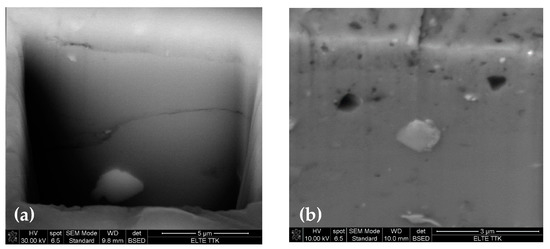 High magnification SEM-FIB images taken from the inner surface of the ion-milled notches of the Mg65Ni20Cu5Y10 fully amorphous alloy deformed by HPT are presented in Figure 8 [116]. The photograph corresponding to the central region of the disk (where the deformation is the smallest, see Equation (1)) presents a couple of larger crystalline regions (typical diameter ~1 μm) embedded in the contrastless amorphous matrix (Figure 8a). EDX analysis of this area revealed that the composition of these blocks is very close to Mg2Ni. Contrarily, the most strained periphery regions show a very different morphology characterized by plenty of crystals ranging from 30 to 500 nm (Figure 8b).