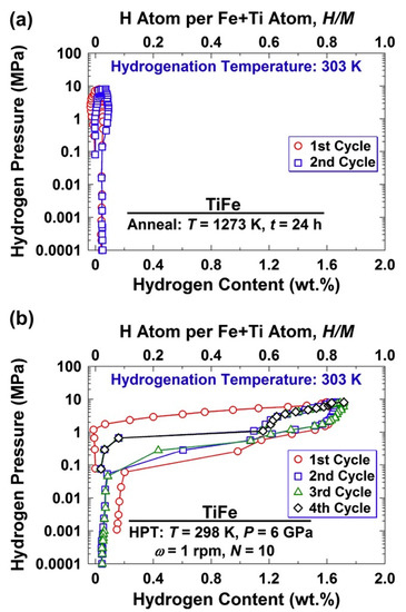 - Edalati, K.; Matsuda, J.; Arita, M.; Daio, T.; Akiba, E.; Horita, Z. Mechanism of Activation of TiFe Intermetallics for Hydrogen Storage by Severe Plastic Deformation Using High-Pressure Torsion. Appl. Phys. Lett. 2013, 103, 143902. [Google Scholar] [CrossRef]