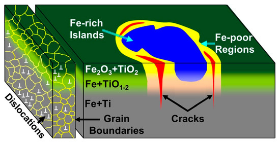 Schematic illustration of the most important microstructural features (i.e., cracks, grain boundaries, dislocations and Fe-rich islands) enhancing the activation of TiFe alloy [121].