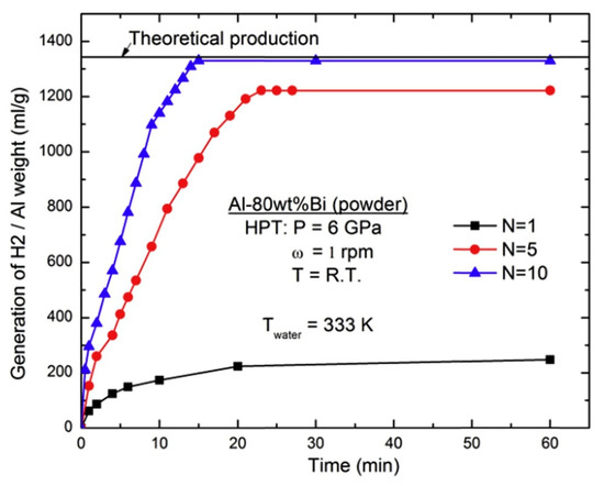 Hydrogen generation against time for Al-80 wt.% Bi alloy processed by HPT with different number of revolutions (N = 1, 5, 10) [135].
