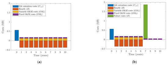Illustration of how the benefits and costs are distributed in time in the extended life: (a) when there is no failure in the extended life; (b) when there is a failure in year seven.
