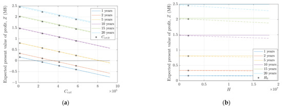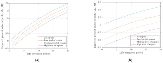 The starting point for the analyses is outcomes of fatigue lives from the deterministic method. Figure 3 shows the expected present value of the profit, , calculated using Equation (14) for life extension periods 1, 2, 5, 10, 15, and 20 years for the four levels of retrofits. In Figure 3a, the economic input presented in Section 3.1 is used, and in Figure 3b, the power price is reduced from $50/MWh to $30/MWh. For the case of no repairs, all life extension periods lead to a positive expected present value of the profit, but for the low power price, the margin is narrow. Increasing the costs of retrofits translates the graph downwards, and higher life extension periods are required to get a positive expected present value of the profit. For the high power price, all life extension periods above 5 years will lead to positive profit, but for the low power price, a 5 year life extension period is only feasible if no retrofits are necessary. For a 10-year life extension period, the low retrofit level is also feasible, whereas higher life extension periods are required for the medium retrofit level, and 20 years of life extension is not even sufficient for the high level of repairs.