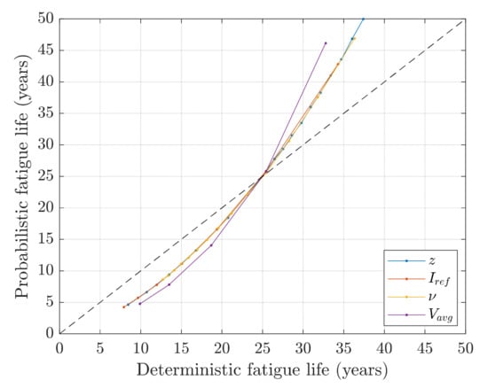 The outcome of the probabilistic assessment can be related to the outcomes of the deterministic assessment using the models in Section 2.1 and Section 2.2 with the same assumptions on input. The probabilistic fatigue life is here understood as the point in time where the annual reliability index drops below the target value for structural components in new wind turbines, . In Figure 4, the probabilistic fatigue life is shown as a function of deterministic fatigue life for variations of design parameter , reference turbulence intensity , the annual number of load cycles , and 10-min mean wind speed at hub height . The design assumptions correspond to a deterministic fatigue life period of 25 years, as the design parameter was determined to fulfill this. Here, the probabilistic model also gives a fatigue life of 25 years. However, for smaller or larger deterministic fatigue lives than 25 years, the probabilistic model results in a different result; for deterministic fatigue lives larger than 25 years, the probabilistic analysis gives larger fatigue lives than the deterministic model, and for deterministic fatigue lives below 25 years, the opposite is the case. Changes in design parameter, turbulence intensity, or the annual number of load cycles have a similar effect. A change that increases the deterministic fatigue life by 5 years to 30 years (e.g., lower turbulence intensity or fewer load cycles than expected in design) results in almost 10 years of additional lifetime beyond the 25 years for the probabilistic model. Changes in the mean wind speed result in even larger deviations of the fatigue life found by the deterministic and probabilistic model.