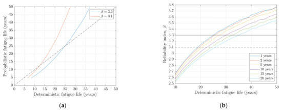 In Figure 5a, the relationship between deterministic and probabilistic fatigue life is shown for reliability index and for variations of design parameter (which gives the same result as variations in turbulence intensity and the number of load cycles). It is seen that acceptance of a reliability index of will generally result in more than 15 additional years of operation than for deterministic fatigue lives larger than 25 years. The same can be seen in Figure 5b, where the reliability index in the last years of the extended life is shown as a function of deterministic-assessed fatigue life for life extension periods 1, 2, 5, 10, 15, and 20 years. This figure more clearly shows the relationship between assessed deterministic fatigue life and reliability index.