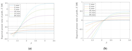 Expected present value of the profit as a function of the reliability index in the last year of the extended life, for life extension periods: 1, 2, 5, 10, 15, and 20 years for: (a) PPA = 50; (b) PPA = 30. The dashed lines correspond to the costs of retrofits for (from the bottom): no repairs, low level, medium level, and high level.