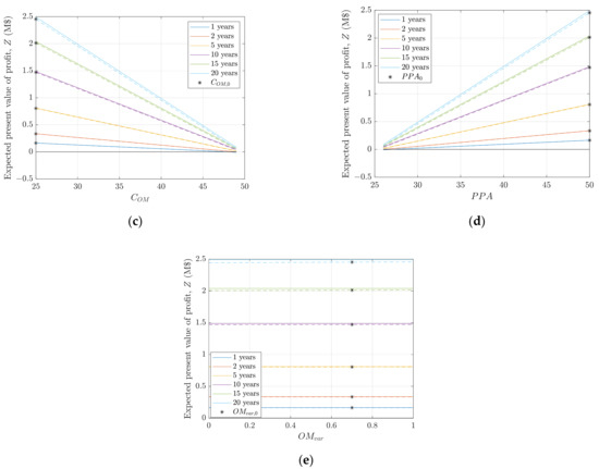In Figure 7, each of the five economic input values is varied one at a time, while the other remains at their initial value. The varied economic input values are: (a) life extension costs , (b) failure costs , (c) annual operation and maintenance costs , (d) power price PPA, and (e) operation and maintenance costs variable proportion . The figures show the expected present value of the profit when the risk of failure is not considered (solid lines), and when it is considered (dashed lines), for a turbine with a deterministic design fatigue life of 25 years.